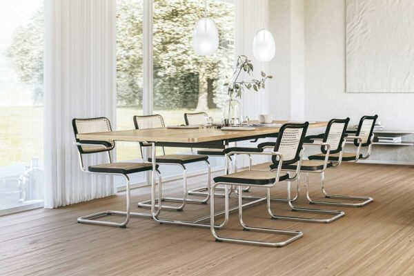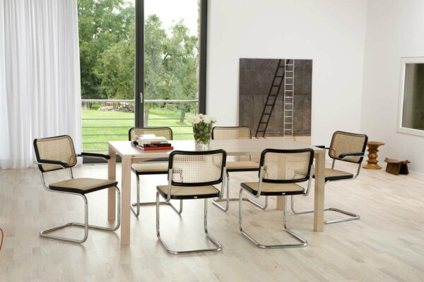 Die zeitlos schönen Stahlrohr-FreischwingerDiese Entwürfe des Freischwingers S 32 sind die wohl bekanntesten und am meisten produzierten Stahlrohr-Klassiker. Ihr wichtigstes Merkmal ist die ausgereifte konstruktive Form und die geniale ästhetische Verbindung von Stahlrohr, Holz und Rohrgeflecht. Der Entwurf fällt in Breuers fruchtbare Berliner Jahre 1928 bis 1931, in denen er, am Bauhaus ausgeschieden, sich als Architekt und Innenarchitekt selbständig machte und eine Reihe großartiger Interieurs realisierte und zahlreiche Möbel entwarf. Thonet produziert diese Modelle seit 1930. Durch die ästhetische Reduktion und Klarheit passen sie in viele Bereiche: Konferenz, Wartezonen, Restaurants und in die Wohnung.