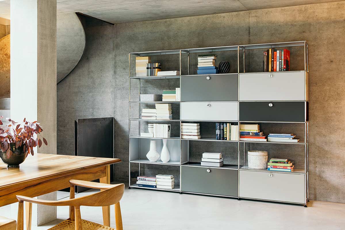 Wachstum in allen RichtungenPräsentieren Sie Ihre Bücher und Schätze in einer stilvollen Umgebung. Verwenden Sie das modulare USM Möbelbausystem, um Bücherregale, Vitrinen und Regalwände zu entwerfen, die Ihr Zuhause verwandeln und die Schönheit der Dinge, die Ihnen am Herzen liegen, gekonnt in Szene setzen. Vitrinen aus Glas und Chrom der modularen Regale lassen Ihre Skulpturen und Lieblingsstücke in einem neuen Licht erstrahlen. Weiße Möbel jeder Größe bilden einen neutralen, aber eleganten Hintergrund für Bücher und andere Einrichtung und passen perfekt zu jedem Farbschema. Rote, gelbe und andere leuchtende Farben können als Basis für außergewöhnliche Wohnwände dienen.