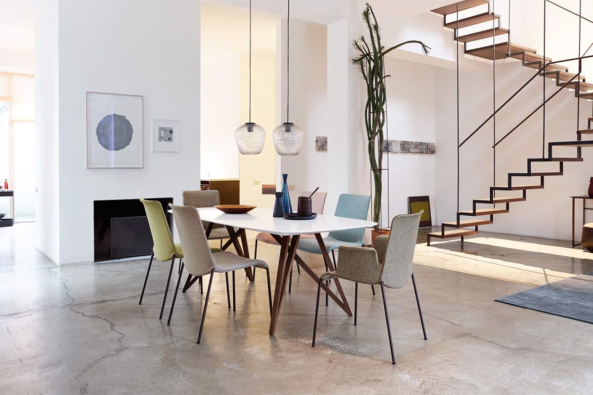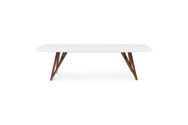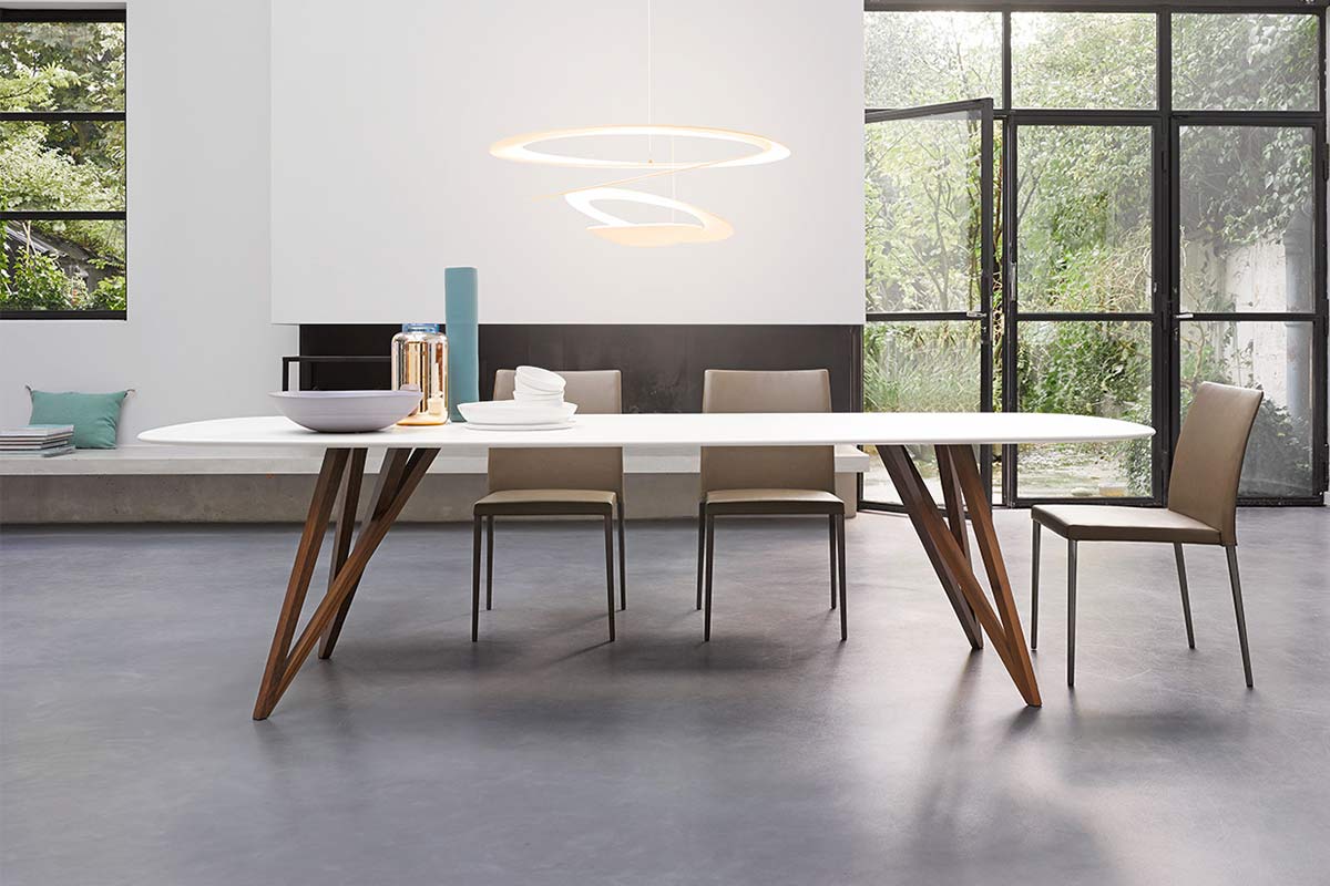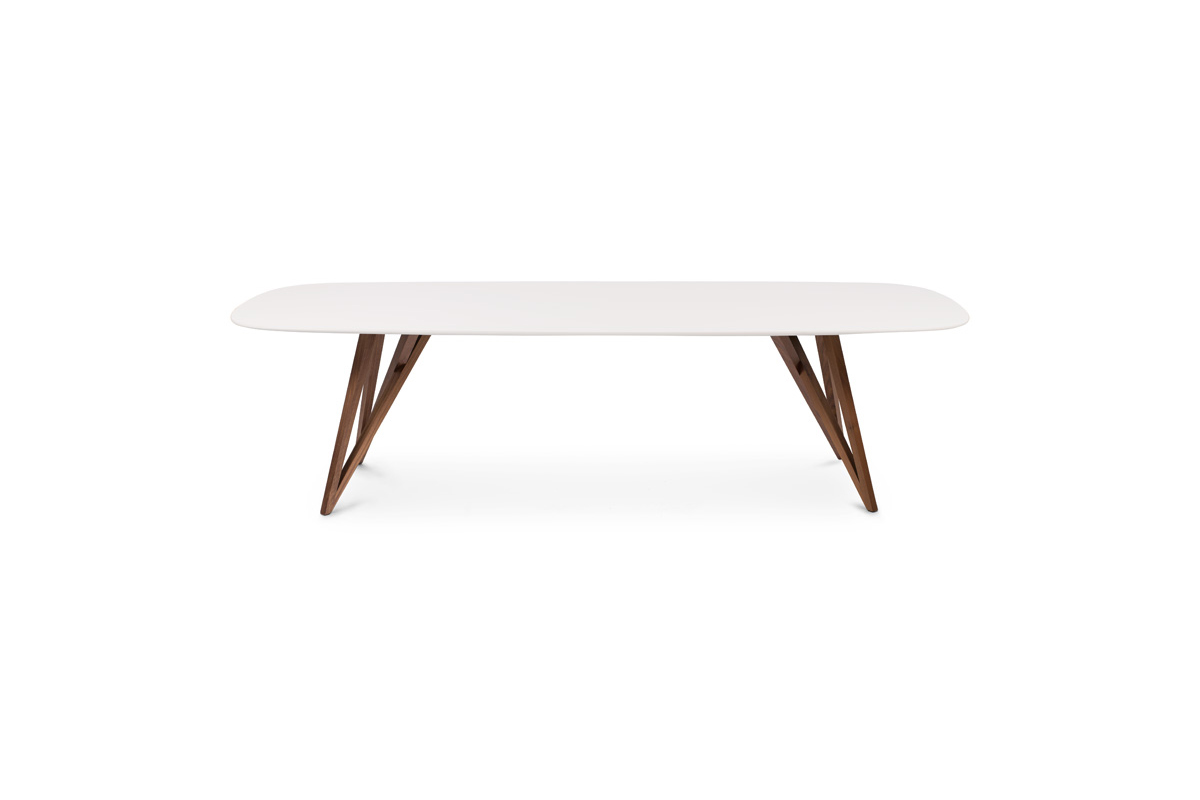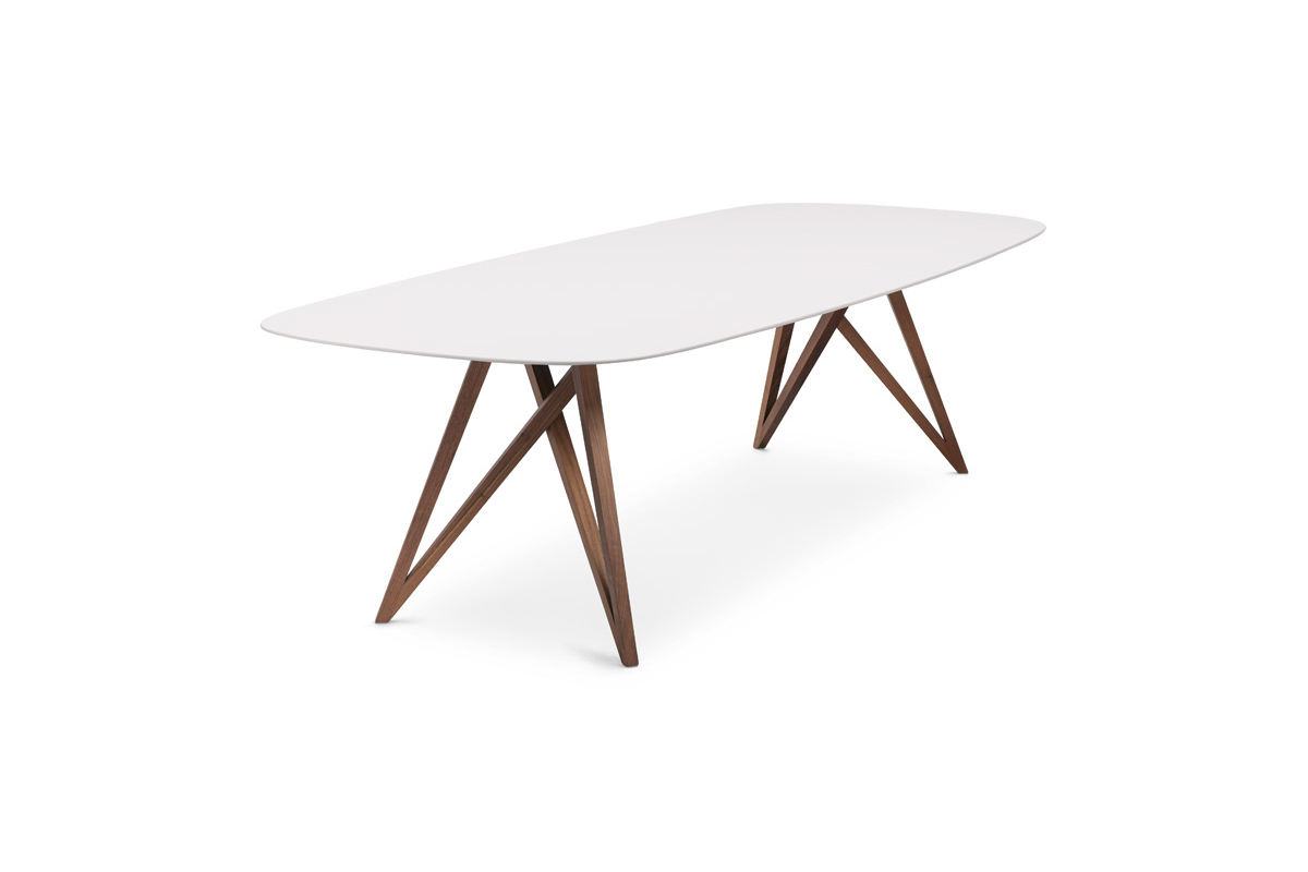 Eine Tisch-SkulpturEs gibt Tische, die keine großen Inszenierungen benötigen. Sie ziehen allein durch ihre Einzigartigkeit die Blicke auf sich. So wie der Tisch Seito. In der Balance von Linie, Winkel und Fläche gestaltet dieser Esstisch spielerische Leichtigkeit. Effektvolles Understatement: die Tischplatte aus weißem Quarzstein getragen von einem Gestell aus edlem Nussbaumholz. Herrlich, sich in bester Gesellschaft an einer solch eindrucksvollen Tafel zu versammeln