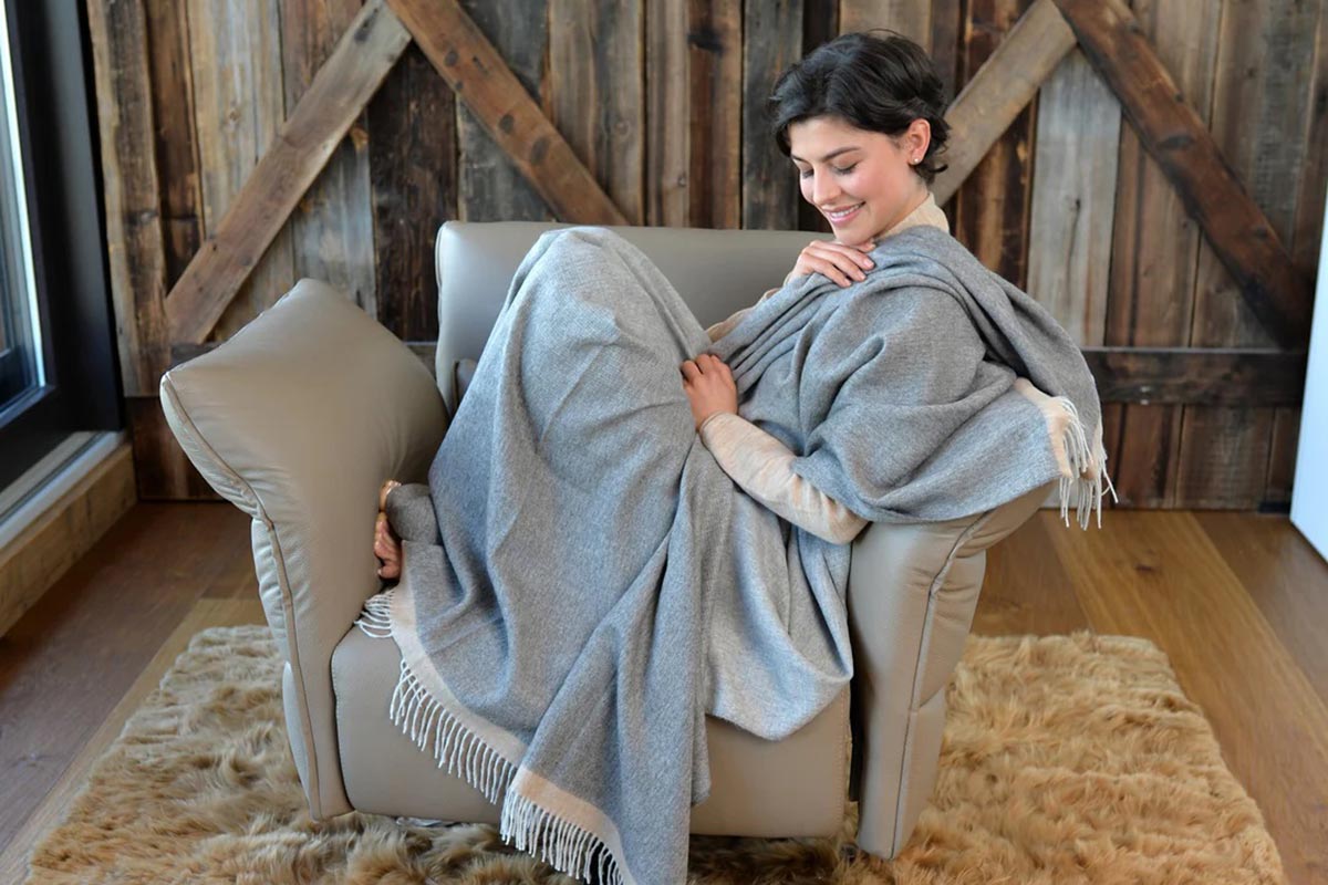 Der elegante FarbverlaufDurch die hervorragenden Thermoeigenschaften der Alpakafaser sorgen die herrlichen Decken aus Ultrafine Alpaca-Wolle für eine wundervolle Wärme und laden unwiderstehlich zum Einkuscheln und Entspannen ein. MERIMA bedeutet in der Übersetzung Sonnenschein, der im eleganten und weichen Farbverlauf des Plaids reflektiert wird. Durch die herausragenden Thermoeigenschaften der Alpakafaser hält diese elegante und herrlich leichte Decke angenehm warm. Ihre zeitlos schöne Farbgebung ist vor allem in moderneren Interieurs ein dekoratives Highlight. Maße: 180 x 130 cm