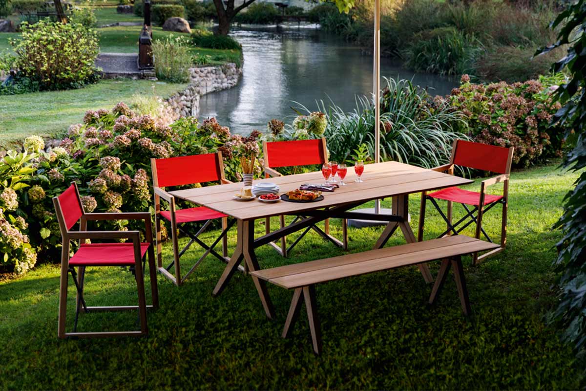 Passende Bank zum Tisch LoftDas Loft Programm von Weishäupl beeindruckt mit feinen Details. Beispielsweise einer Bank, deren spezielle Ergonomie für Sitzkomfort sorgt. Weishäupl bietet sie in verschiedenen Längen zu den formschönen Tischen aus massivem Teakholz an. Der passende Loft Sessel mit absolut wetterfesten, pulverbeschichteten Aluminiumdetails greift die klassische Form des klappbaren Regiestuhls auf. Selbstverständlich kann er mit jedem der vielseitigen Acryltuch-Stoffen bezogen werden.