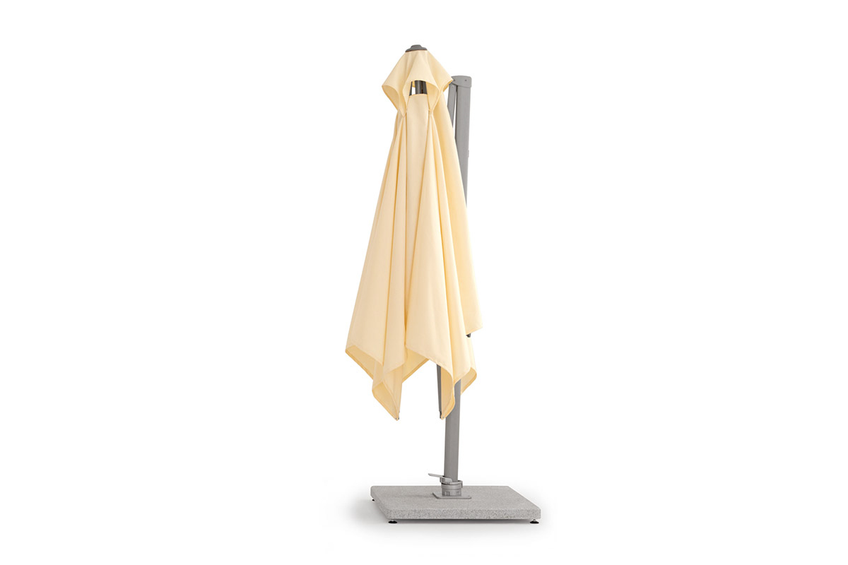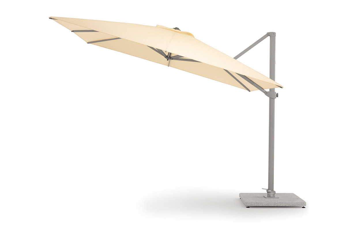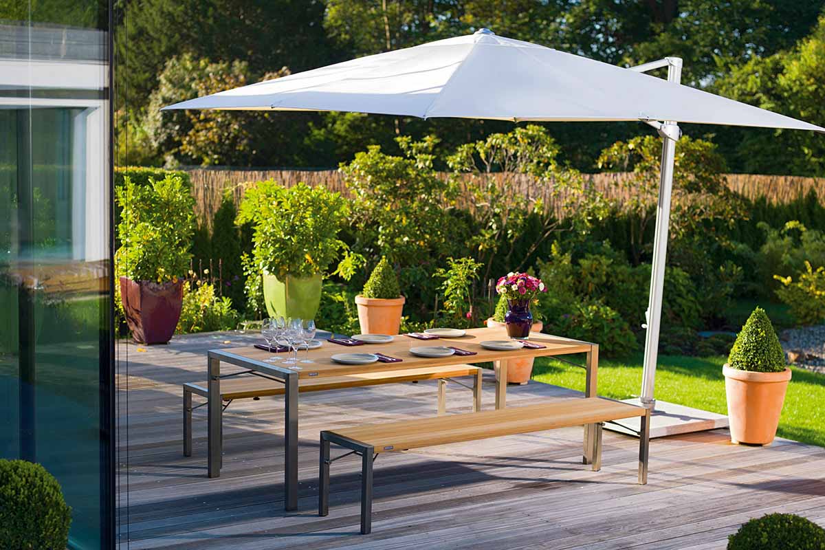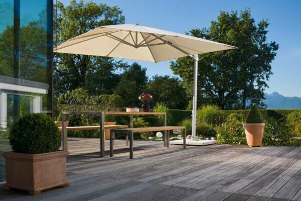 Praktischer Sonnenschirm mit KurbelmechanismusDer Freiarmschirm von Weishäupl überzeugt mit klaren Argumenten: beispielsweise seinem leichtgängigen Kurbelmechanismus, der das Aufspannen zum Kinderspiel macht. Dank seiner fein gefertigten Alukonstruktion ist er schwenk- und drehbar – und passt sich so dem Sonnenstand mit einem einzigen Handgriff an.