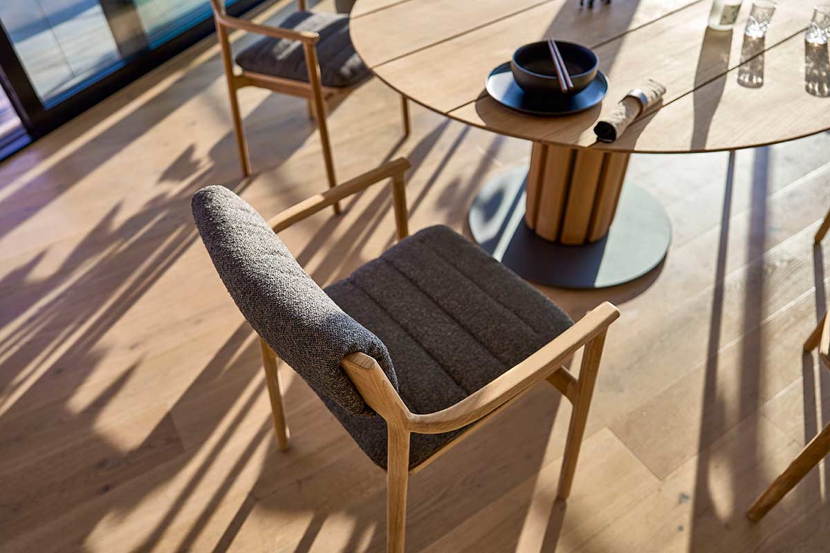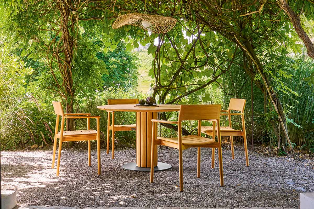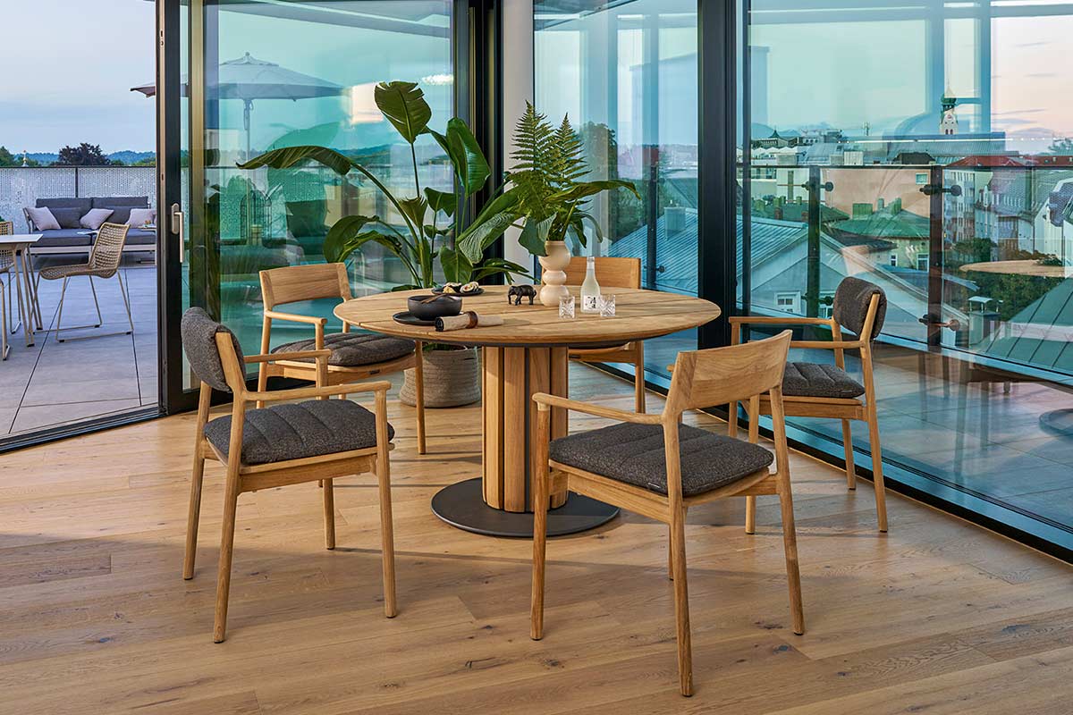 Zeitloses Design für Innen & AußenDer Weishäupl Tisch Teva verbindet zeitloses Design mit einem Lebensstil, bei dem Innen- und Außenbereiche nahtlos ineinander übergehen. Klare Formensprache, erstklassige Verarbeitung und authentische Materialien schaffen eine entspannte, natürliche Atmosphäre – perfekt für Wohnzimmer, Wintergarten oder Terrasse. Der runde Mittelsäulentisch ergänzt filigrane, handwerklich präzise Sessel aus Teakholz und verleiht dem Ensemble Ruhe, Klarheit und elegante Präsenz. Teva wird so zum Mittelpunkt jeder stilvollen Outdoor- oder Wohnumgebung und überzeugt mit Ästhetik, Funktionalität und Langlebigkeit.