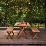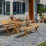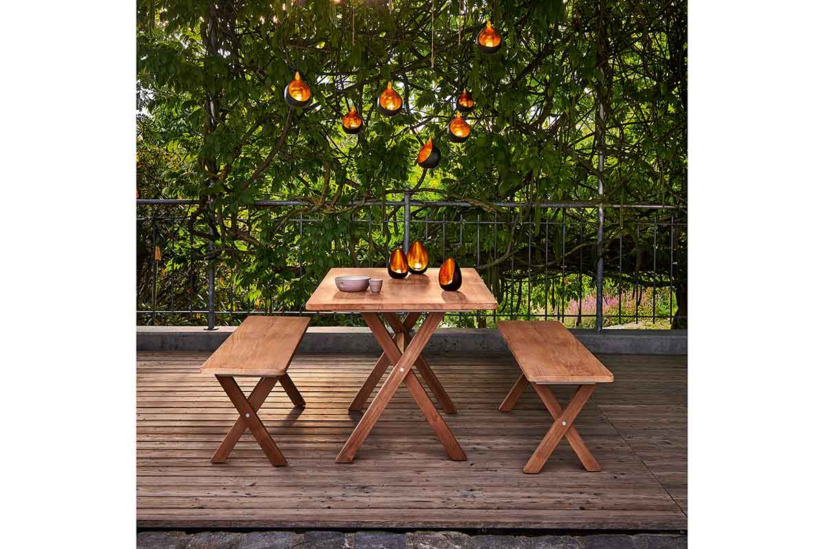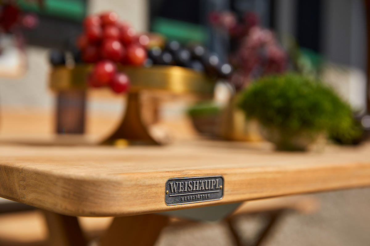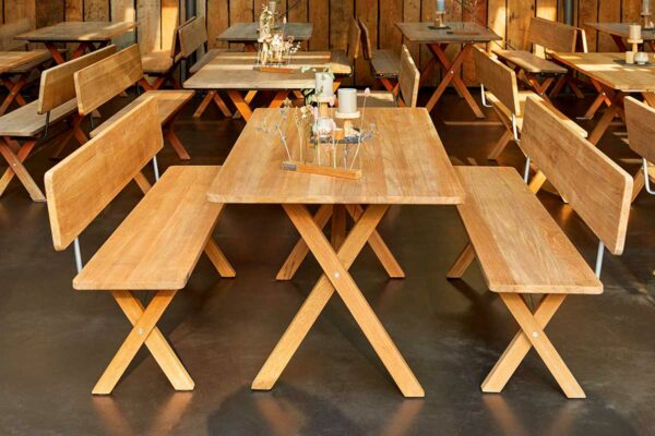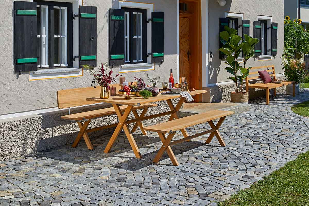 Unkomplizierte und platzsparende Gartenmöbel. Das ist Cross von Weishäupl aus massivem Teak. Die Bänke gibt es in zwei Längen. Durch abnehmbare Rückenlehnen und bequeme Polsterauflagen laden sie zum Sitzenbleiben ein. Passend dazu bietet Weishäupl verschieden lange Tische an. Alle Möbel erreichen mithilfe kreuzförmig angeordneter Edelstahl-Seilverspannungen eine hohe Längsstabilität.