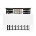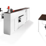 Ausstattungsdetails- und -optionen: Tresenelement, Sitzelement, Aufsatzschränke, Seiten-, Eck- und Deckenblenden, Breitschübe, Akustikfronten, div. Materialschalen, Flipchart
