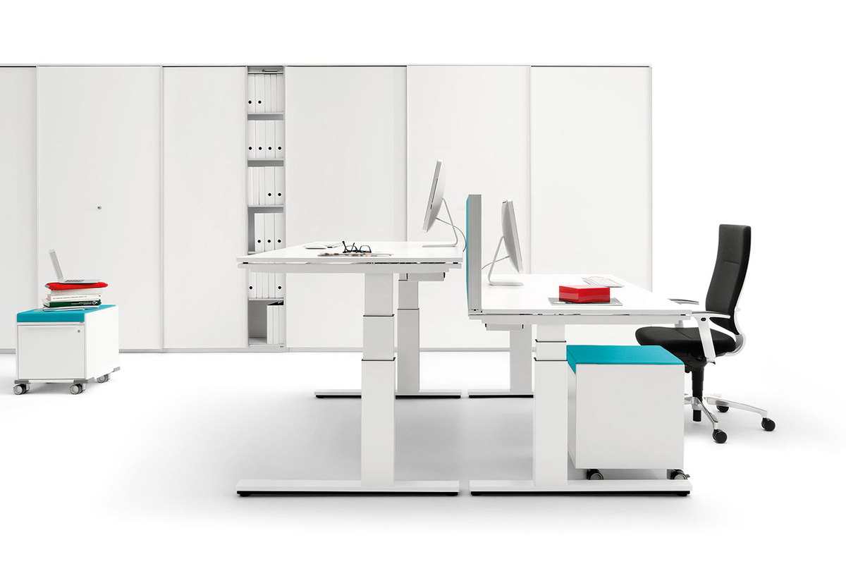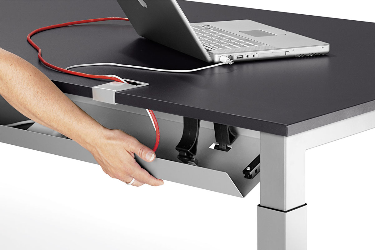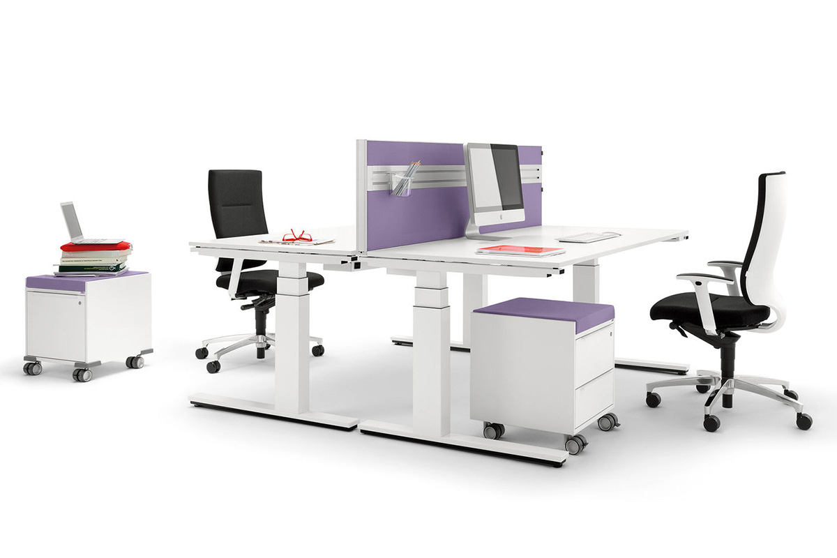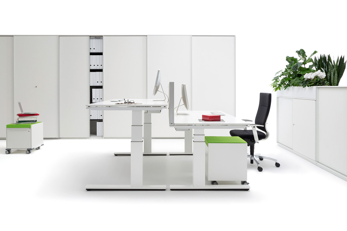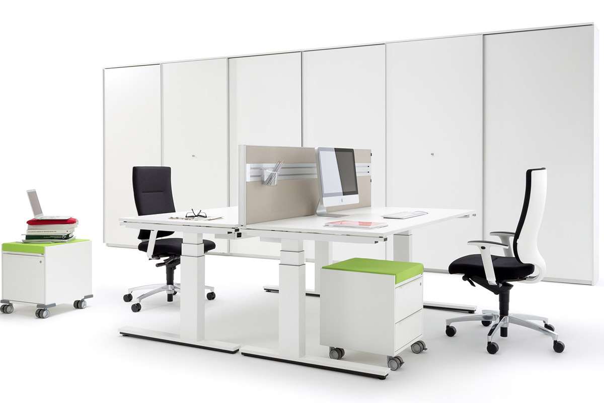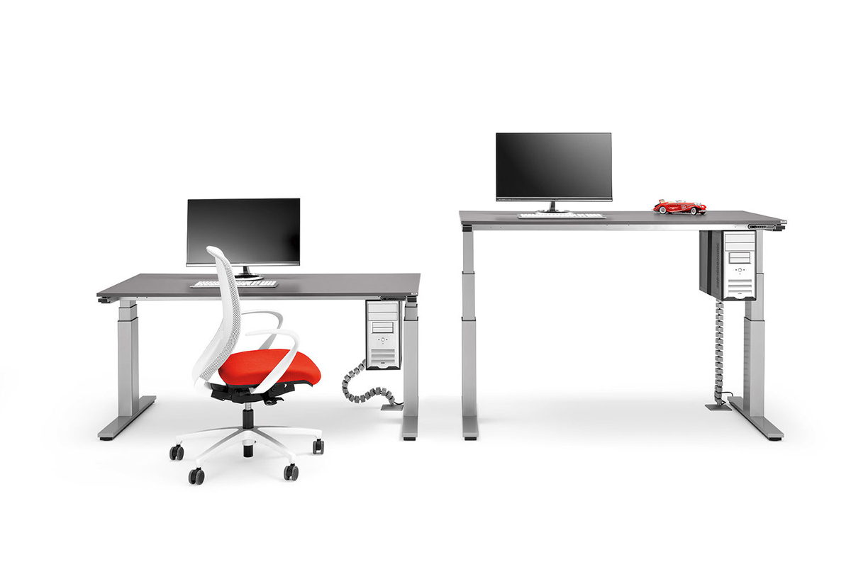Entsprechend der neuesten EU-Norm EN 527-1:2011 bietet das flexible Tischsystem serienmäßig eine werkzeugbasierende Höheneinstellung von 65 bis 85 cm sowie gegen Aufpreis eine Kurbelverstellung für C- und T-Fuß-Gestelle. Erweitert wird das ergonomische System durch elektromotorisch höhenverstellbare Steh-Sitz-Tische mit einem Verstellbereich von 65 bis 125 cm und integriertem Antikollisionsschutz.