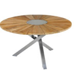 Der Tisch Oryx aus der greenline-Kollektion von Zebra besticht durch exklusives Design und hochwertige Materialwahl. Der Tisch hat ein Durchmesser von 120 cm. Die Tischplatte ist aus recyceltem Teakholz hergestellt und durch den sehr hohen natürlichen Ölanteil vor Witterungseinflüssen geschützt. Das außergewöhnliche Gestell ist aus Edelstahl gefertigt.