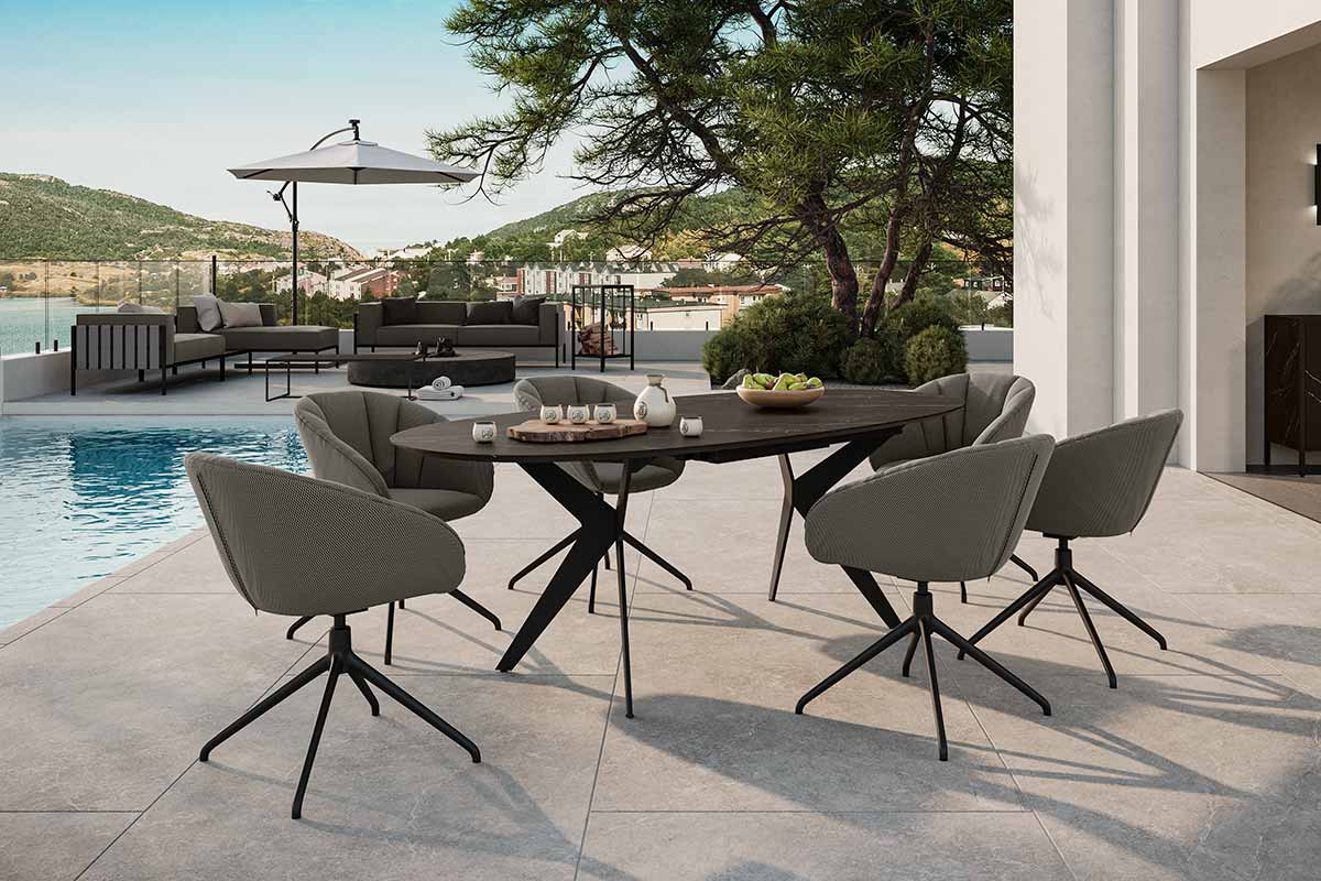 Entdecken Sie Zumsteg Lana: Ein vielseitiger Gartentisch in rechteckiger, bootsförmiger und ovaler Form, erhältlich in verschiedenen Größen. Mit einer eleganten Keramikplatte und Tischbeinen aus hochwertigem Edelstahl oder CNS. Wählen Sie zwischen Fixtisch oder Ausziehtisch für maximale Flexibilität im Garten.